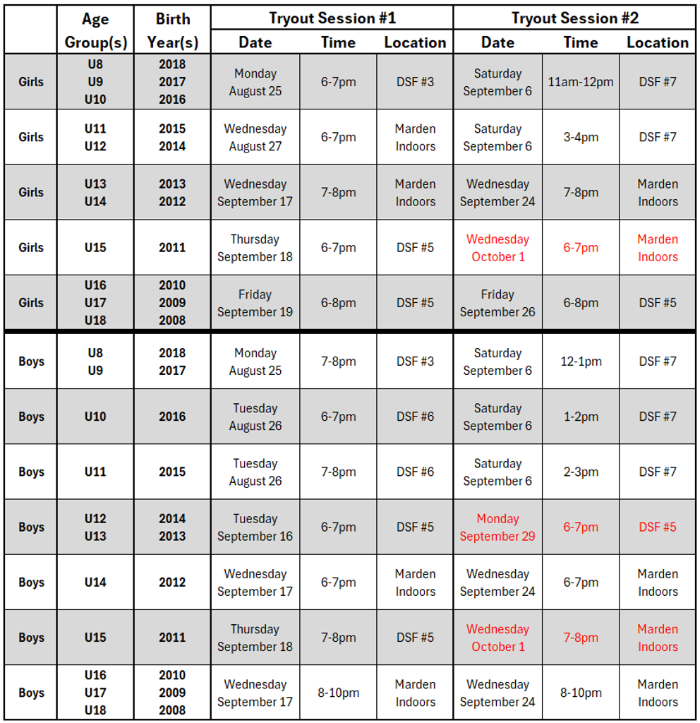 2025 TRYOUT SCHEDULE IS NOW AVAILABLE! SEE BELOW FOR SCHEDULE, FIELD LOCATIONS AND REGISTRATION LINKS.